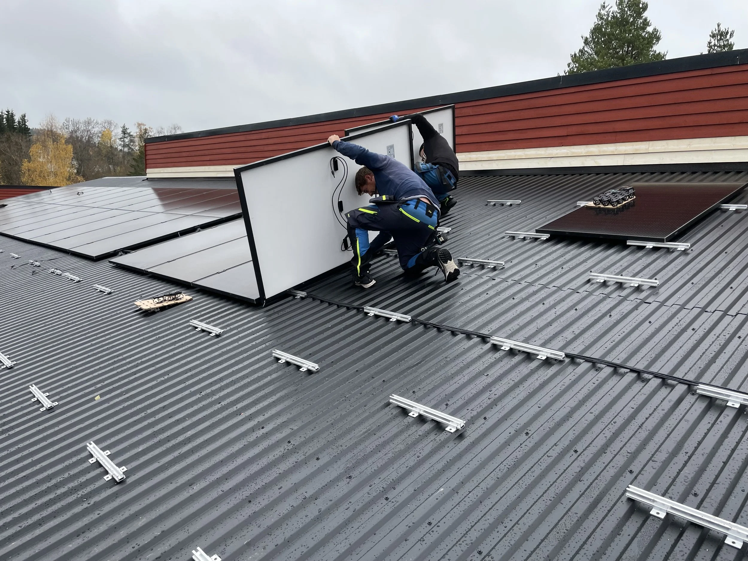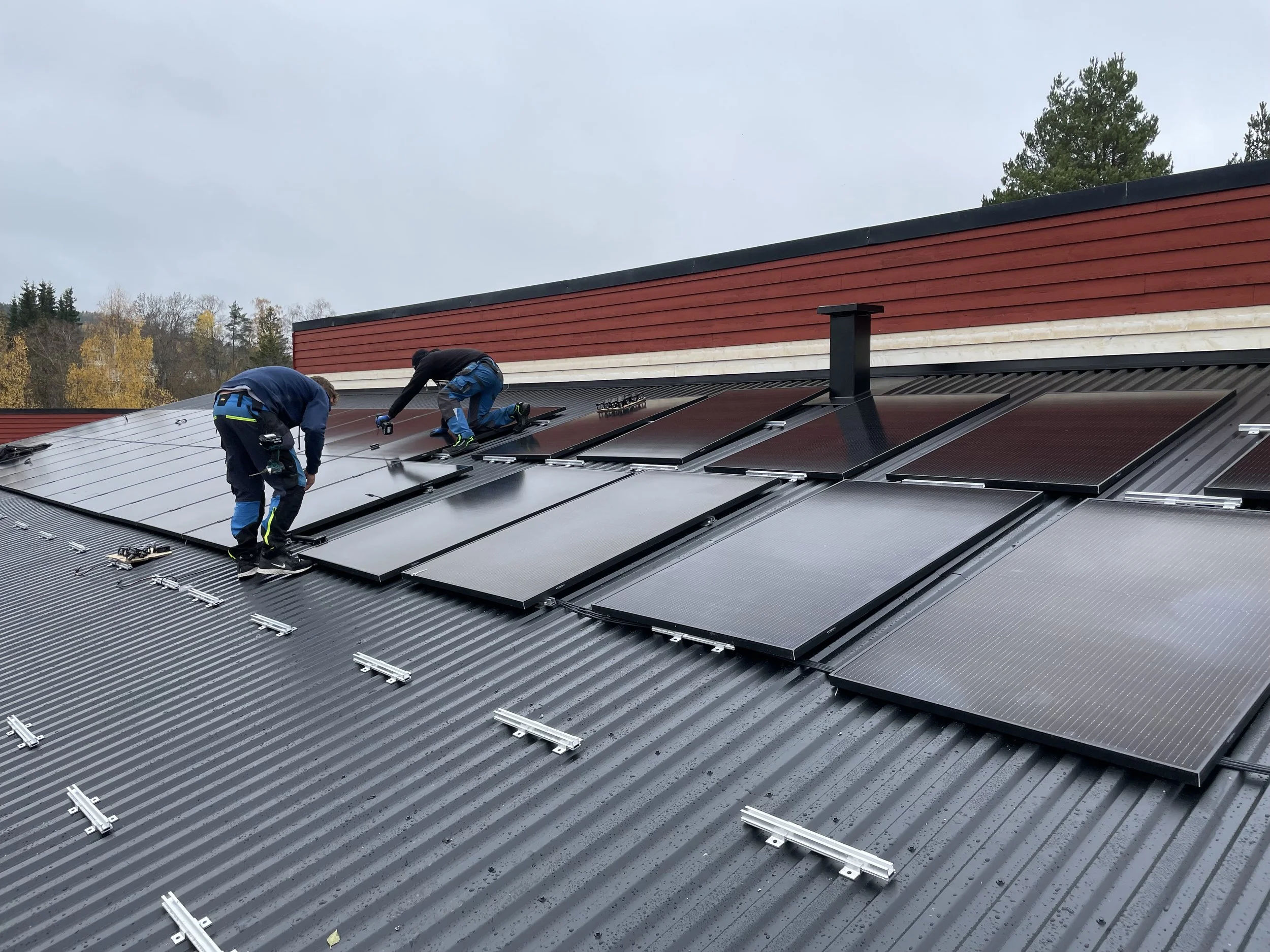 Også hos Norges Vel er vi nå iferd med å prøve ut solenergi. Her fra monteringen av solcellepaneler på taket til hovedadministrasjonsbygget på Hellerud gård i Lillestrøm kommune høsten 2022.