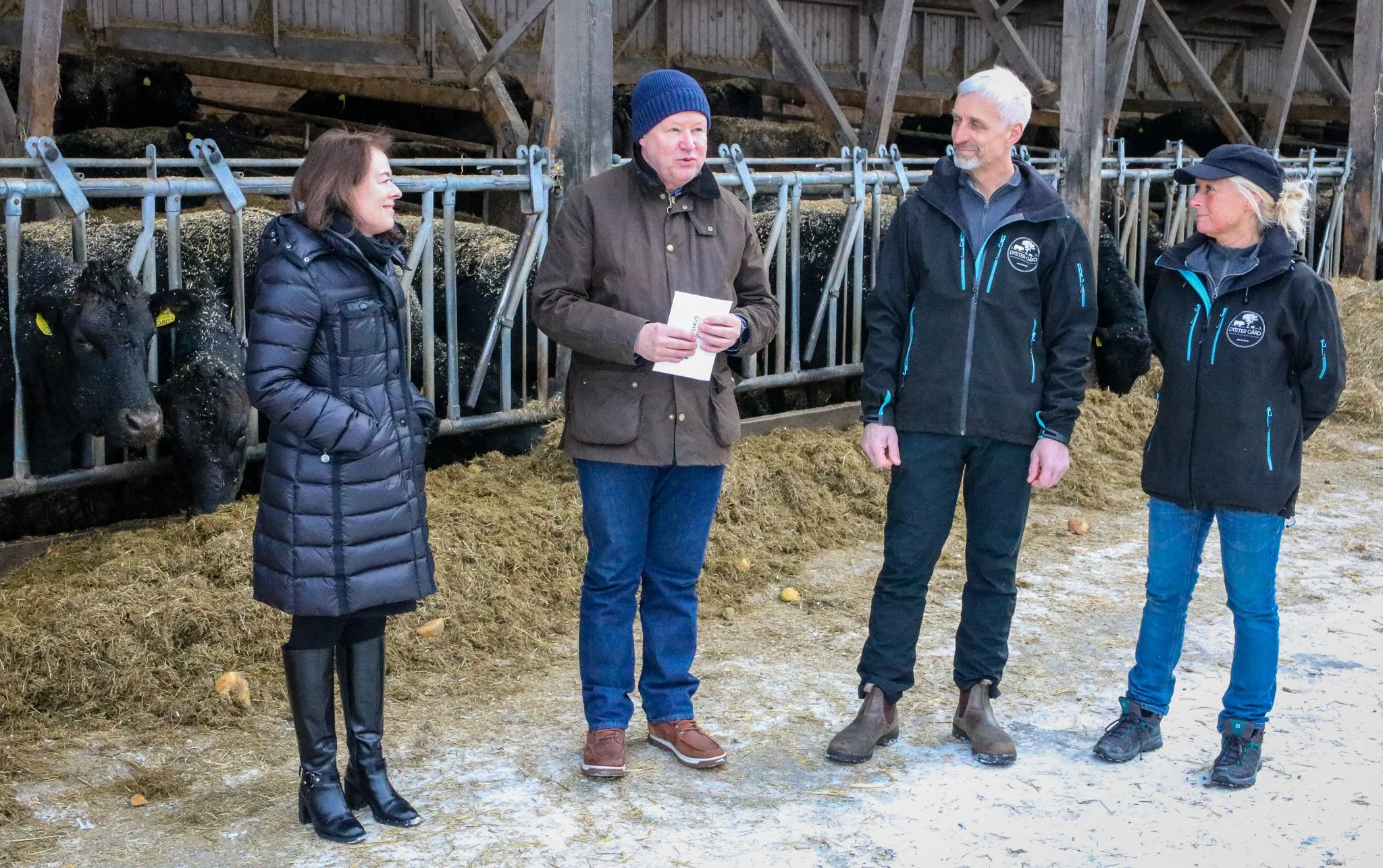Det var blant 200 sosiale kuer og 50 aktive og nysgjerrige griser hos Johan og Tove Bjørneby (til høyre) på Dyster gård på Ås sist fredag, at nyheten om Akershus fylkeskommunes nysatsing på lokalmat ble sluppet. Til venstre prosjektleder Turi-Britt Kuepers fra Norges Vel og fylkesråd for næring, idrett, mangfold og folkehelse, Lars Birger Salvesen. Foto: Frank Tindvik, AFK.