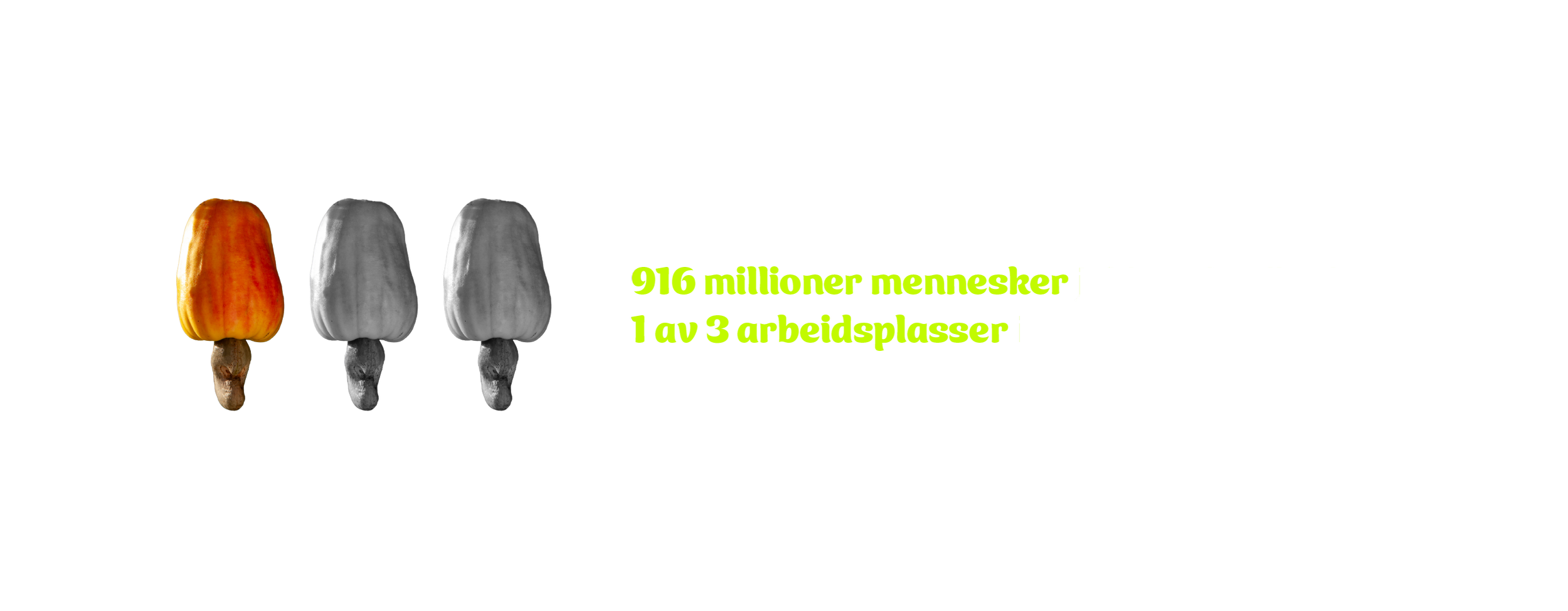 Rundt 916 millioner mennesker jobber i landbruket globalt. Og tar vi med hele matsystemet, fra transport og foredling til salg, handler omtrent to av fem arbeidsplasser i verden om mat.